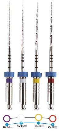 - Instrumente rotative din aliaj de nichel-titan Instrumentele rotative din nichel-titan sunt mult mai flexibile comparativ cu cele tradiționale din oțel inoxidabil. Elasticitatea crescută a acestora permite abordarea canalelor extrem de curbe și o mai bună preparare. Aceste instrumente ne permit să lucrăm eficient și calitativ. Cu aceste instrumente canalele radiculare sunt lărgite corespunzător și pregătite pentru o obturație radiculară tridimensională, compactă.